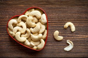 Research shows that eating more nuts, such as cashews, can lower your risk for cardiovascular disease. This may occur by reducing blood pressure and “bad” cholesterol levels. Nuts are naturally cholesterol-free and contain good amounts of heart-healthy fats, fiber, and protein. They also contain arginine, which protects the inner lining of artery walls.
