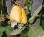 Cashew tree bears numerous, edible, pear shaped false fruits or “accessory fruits’” called “cashew apples.” Cashew nut which actually is a “true-fruit”, firmly attaching to bottom end of cashew-apple, appearing like a clapper in the bell. Botanically, this tiny, bean shaped, grey “true fruit” is a drupe, featuring hard outer shell enclosing a single edible kernel known commercially as “cashew nut.”